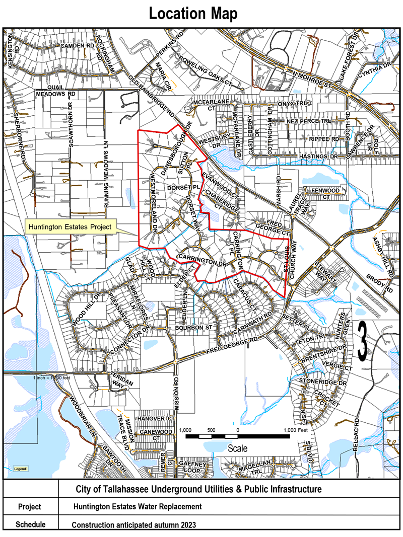 The City of Tallahassee is gathering information about a potential water system improvement project for the Huntington Estates neighborhood. The project, if constructed, will include replacing water mains, fire hydrants and service laterals in the areas shown below. These utility improvements are part of the City’s proactive program to replace aging utility infrastructure and provide safe, reliable utility service to customers for many years.